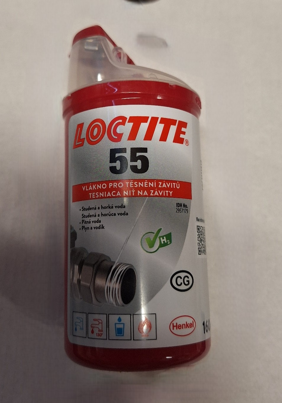 Těsnící šňůra Loctite 55 typ 450. Délka 160 m. Pitná voda max. 90 °C a PN 16. Horká voda max. 130 °C a PN 7. Plyn -20 až 70 °C a PN 5.